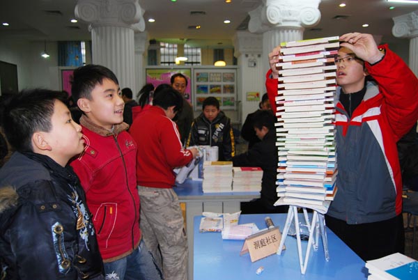 洞庭社区代表队的同学们小心翼翼的将书放在搭的“报纸书桌”上。