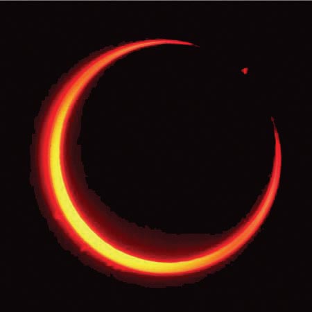 拍摄于土耳其附近的安卓山,这张数字影像记录了月亮穿过太阳与地球之间的数个阶段;在最中间的定格,可见到月亮完全遮掩太阳的日全食,当时全黑的月面周围镶着太阳壮观的日冕。