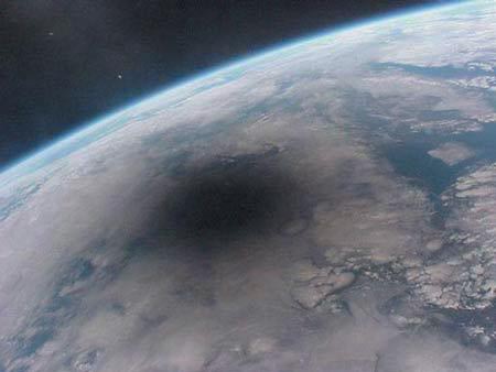 地点:和平号空间站 照片拍摄于1999年日全食发生时月球在地球上的影子。