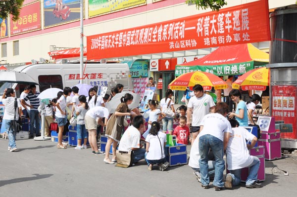 7月3日开始,由、北京天文馆、武汉科技馆组织、作为“2009国际天文年暨中国武汉观测日全食系列活动”之一的“科普大篷车巡展”冒着酷暑连续在我市江夏、新洲和洪山区进行巡展。