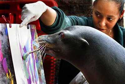 不仅大象和猩猩具有绘画天赋,海狮学习绘画也很内行。美国匹兹堡市动物园及其附属的PPG水族馆内就生活着这样一头13岁的海狮“麦琪”,由该动物园内一位名叫凯莎•法尔斯的驯兽师一直训练它学习绘画,3个月就掌握了如何用嘴握住画笔以及怎样使用画笔在画布上绘画的本领。