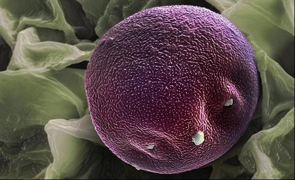 带有粉红色斑点的绿色捕蝇草花粉颗粒。虽然捕蝇草未必比勿忘我大出多少,但它的花粉微粒约却比勿忘我花粉大许多。