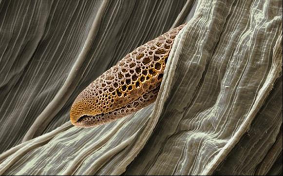 这颗山杨柳花粉粒被夹在了两片花瓣之间,它没能传播到柱头,很快就会死亡。当春风吹拂杨柳时,一些花粉就会被抛入空中。在蜜蜂的帮助下,完成它们的使命。
