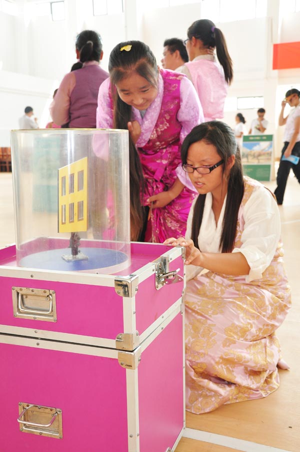 体验人体导电,尝试隔墙观物,探究昆虫视觉……20多件科普展品涉及光学、电磁学、力学等学科,同学们兴奋地动手操作这些充满趣味的科学仪器,每件展品前都排起了长长的队伍。3D展板是最受欢迎的,展板采用先进的立体技术,将普通的平面图像由二维转变为三维,使图像呈现出更加真实、生动、直观的立体效果。高一(1)班的白玛德吉同学高兴地对记者说:“以前我们都是在书本上学知识,在多媒体课上看实验,但能亲自动手操作,今天还是第一次,我太喜欢这辆科普车了,真希望它能常来我们学校!”
