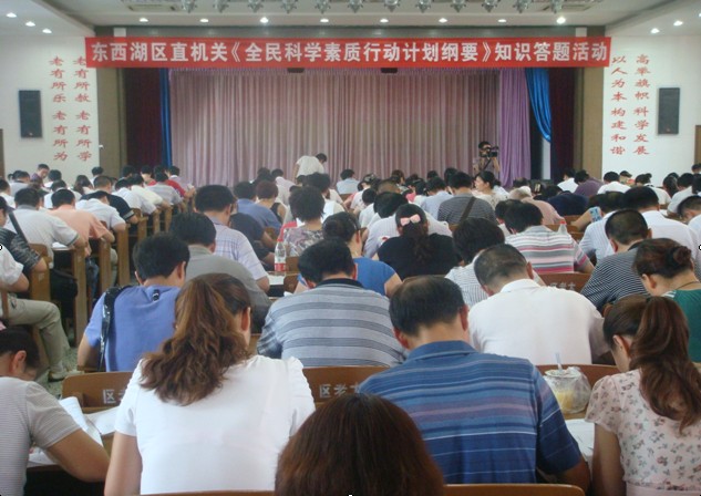 区直机关工委牵头组织区属委、办、局和人民团体《纲要》试卷答题活动。鉴于机关工作的实际情况,他们采取了集中考试和分散答题相结合的形式,很好地解决了机关日常工作与知识答题活动的矛盾。9月19日,时值全国科普日活动期间,东西湖区机关工作人员《纲要》知识答题活动主会场在老年大学会议室举行,全区56家区直单位400多名机关工作人员在此集中进行试卷答题,再次掀起学科学、用科学、爱科学的活动高潮。
