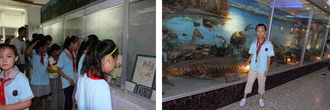 一进入标本馆,映入眼帘的是蛇、蛤蟆等动物的标本,样子很恐怖,胆小的女生差点被吓哭了。接下来的植物标本女生较为喜欢,她们比赛看谁认识的植物多。标本馆分为2个场馆,进入另外一个场馆时,好像进入了动物世界,有漂亮的蝴蝶标本,像美丽的翅膀,有迷人的鸟类标本,像亭亭玉立的少女,还有白鳍豚、大熊猫、狮子等各种珍稀动物的标本,全都栩栩如生地展示在展厅里,展品特色鲜明、内容丰富,集趣味性、观赏性、科普性于一体。