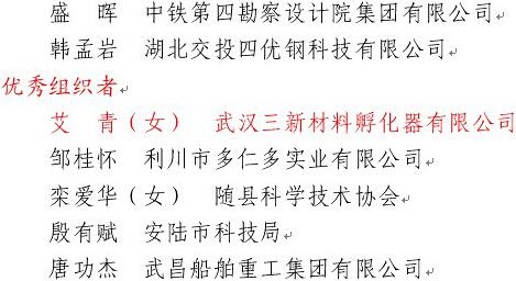 经湖北省科协向中国科协推荐申报,中国科协、发展改革委、科技部、国资委和全国总工会联合发文公示(科协发计字【2014】91号),表彰了全国2014年“讲理想、比贡献”活动先进集体、创新团队、创新标兵和优秀组织者,硚口区科协推荐的武汉三新材料孵化器有限公司联合科协主席艾青同志荣获全国“讲理想、比贡献”活动“优秀组织者”。