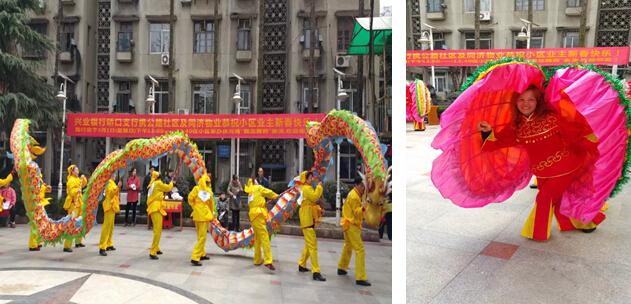 2015年3月1日中午13:00时,硚口区宝丰街公路社区科普文化广场上锣鼓齐鸣、龙狮飞舞。来自兴业银行的2条十米长龙时而腾空翻滚,时而飞跃迴转,充分展示了中华民族意气风发的冲天豪情。紧接着色彩鲜明的“龙”和“狮”在社区主干道巡游,并来到了新建的交通小区,龙腾狮舞的欢庆场面使很多观看的居民纷纷主动加入了欢庆的行列,为社区增添了元宵节喜庆、祥和的气氛,传递着美满的新年祝福。