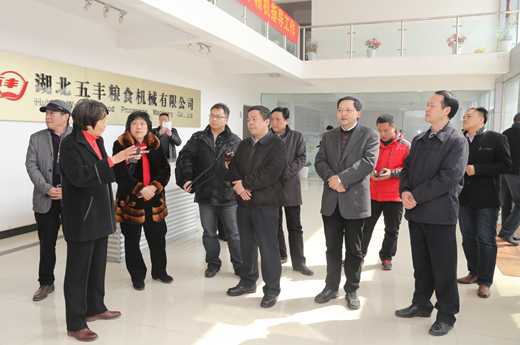 副主席陈光勇(前排右三)与华科大科协常务副主席柳会祥(前排右一)在五丰粮机调研。