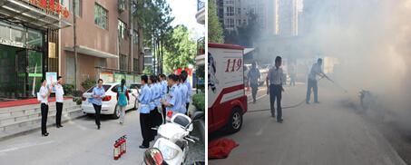 上午,社区工作人员加强宣传造势:到户外挂图、发放防灾手册宣传单和纪念品;下午,在社区办公大楼一楼教室,省消协的熊教官通过一系列的声、像、图课件,让大家身临其境地感受到灾难的无情,随后,通过模拟现场的配电箱短路着火所开展的疏散逃生、消防车实战灭火演练等,让广大居民懂得应急避险和自救互救。物业安保队员的表现也得到到场居民的点赞。