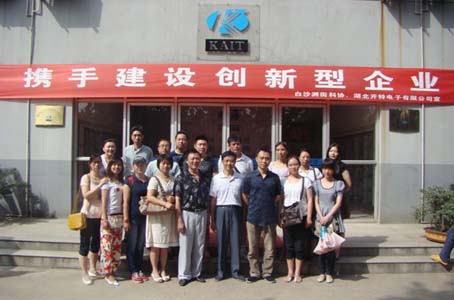 “携手建设创新型企业”的横幅高悬在湖北开特有限公司大门上方。受公司董事长郑海发委托,公司负责人辜同生、张源、胡立军等在大门口与前来参加活动的白沙洲街科普志愿者们一一握手相迎。