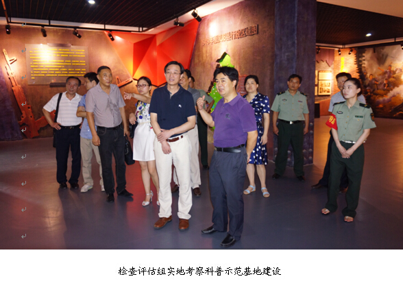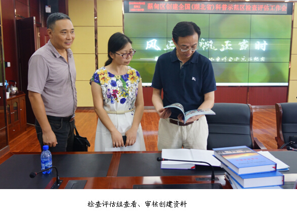 检查评估组首先深入大集街南湖社区和武汉市国防园实地考察了社区科普阵地建设和科普示范基地建设情况。在区信息中心会议室观看了蔡甸区创建科普示范区专题片,听取了区政府张丽筠副区长所作的创建工作情况汇报,组织召开了座谈会,查看、审核了创建材料。