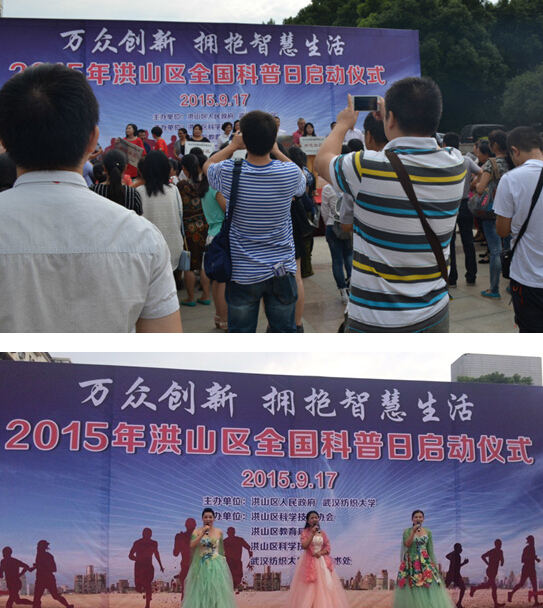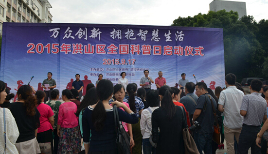 9月17日上午,天气晴朗,阳光灿烂,2015年洪山区全国科普日启动仪式在武汉纺织大学正门广场上举行。