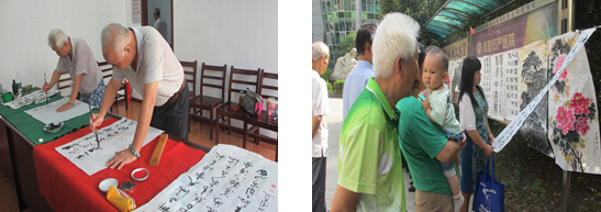 翰墨飘香,育人无痕。在中秋节,国庆节双节即将到来之际,为弘扬中华传统文化,丰富社区居民和中小学生的文化生活,创建和谐社区,9月25日上午,长职苑社区翰墨缘书法协会举办了题为“欢度中秋. 喜迎国庆”的书法展活动。来自该社区的书法爱好者和居民参加了活动。在书法交流活动中,大家共同探讨了一些基础的书法知识和创作心得,并就各自创作的书法作品进行了交流,同时对一些作品进行了点评。社区内擅长书法写作的周克烈老师和王福生老师现场挥毫泼墨,写了一份“振兴中华”的书法作品。他高兴地说,社区举办的这次书法交流活动非常有意义,不但在社区内营造了良好的文化氛围,也促进了邻里之间的和谐相处。今后社区将会多举办类似的活动,为居民搭建更多的交流平台,让社区的文化氛围更加浓厚,让居民生活在这里更加和谐幸福。