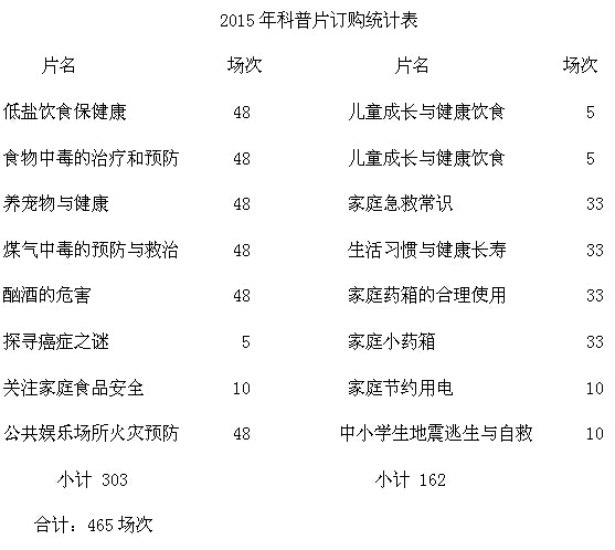 为了做好这次大型的科普电影进社区活动,武昌区科学技术协会要求合作科普电影放映活动服务提供商从国家广电总局公开发行的465部科普片中,精心挑选了30部适合城市市区居民观看的科普片供科协选择。武昌区科学技术协会又从这30部科普片中挑选出与居民切身相关的健康、安全等方面的18部影片在社区放映。重点宣传普及节约资源、保护生态、改善环境、安全生产、应急避险、健康生活、合理消费、循环经济等观念和知识,倡导建立资源节约型、环境友好型社会,形成科学、文明、健康的生活方式和工作方式。由于影片内容精彩,广大居民积极主动参与,活动取得了良好的效果。下表是2015年放映方实际订购影片的情况统计表。