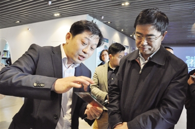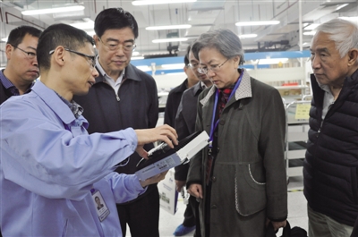 图1,中国工程院院士金涌(左二),国务院参事、国家质监总局原总工张纲(左四),中国工程院副秘书长吴国凯(左一),及中国工程院制造强国战略研究课题组专家一行考察华中数控股份有限公司,武汉市政府副秘书长姜铁兵(前排右三)、湖北武汉院士咨询服务中心副秘书长、市科协巡视员张太玲(前排右二)陪同。图2,华中数控工作人员向专家展示科研产品。