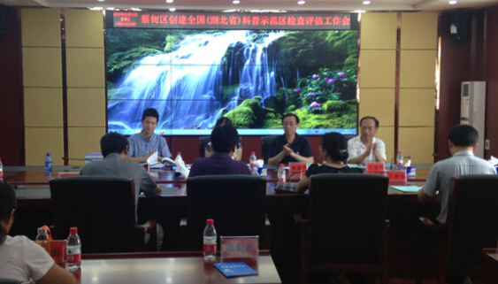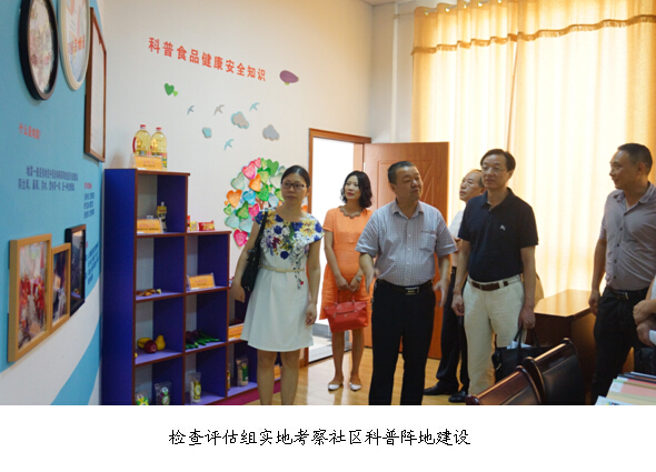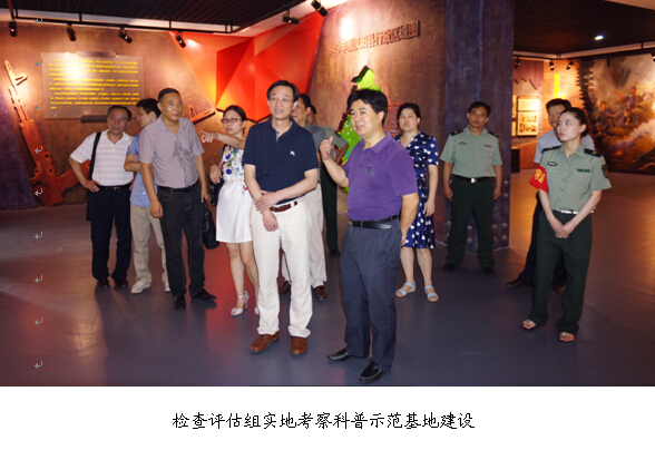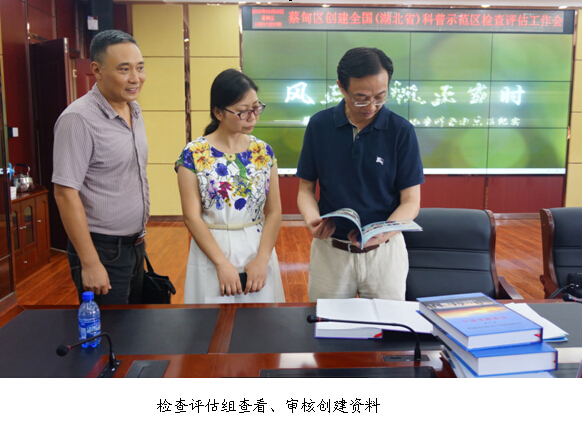 检查评估组首先深入大集街南湖社区和武汉市国防园实地考察了社区科普阵地建设和科普示范基地建设情况。在区信息中心会议室观看了蔡甸区创建科普示范区专题片,听取了区政府张丽筠副区长所作的创建工作情况汇报,组织召开了座谈会,查看、审核了创建材料。