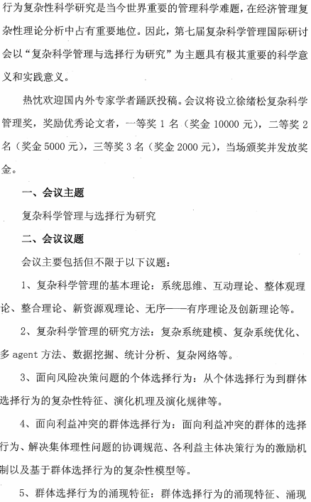 第七届复杂科学管理国际研讨会征稿通知