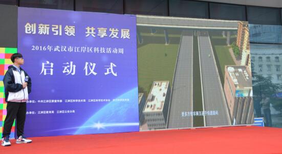 在启动仪式科普展演环节。专业的机器人表演团队,为大家带来了震撼的机器人集体舞,现场设置了魔方机器人PK大赛,邀请中小学生与魔方机器人同场竞技,通过还原魔方比赛,让现场观众近距离感受人工智能的神奇。来自武汉六中的贾子畅同学,通过3D动画形式生动的讲解自己的创新发明——城市快速路高能互通立体交通桥(升级版),直观地展示了创新发明给生活带来的便利。充满了科学思维和科学原理的大型科普魔术秀,让现场的气氛到达了高潮。现场的科技企业展区汇集了来自我区的20家科技型企事业单位,展示了无人机、3D打印设备、体感互动智能系统一体机、智能机器人等40多项高新技术成果以及智慧停车、智慧社区等智慧城市建设成效,与参展市民展开互动。