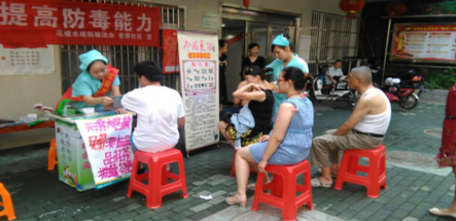 初伏将至,花楼水塔街老甫社区科普志愿者联合天济大药房为社区居民免费量血压,拔火罐,熏艾灸,做理疗,并宣传不喝生水;装水的桶缸等容器要干净;注意饮食安全,不吃腐败变质或污水浸泡过的食物;不吃淹死、病死的禽畜和水产品;另外,可适当在菜肴中增加食醋和蒜,既能增加胃内酸度又能增强胃肠道的杀菌和防御能力。
