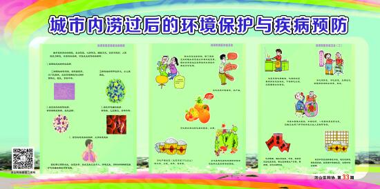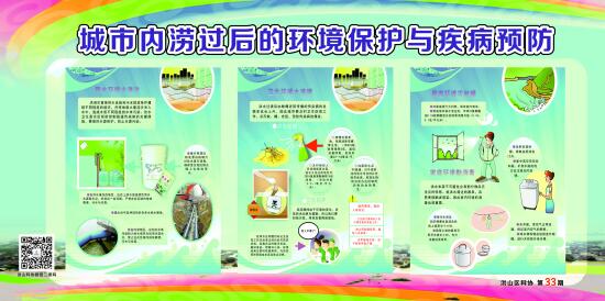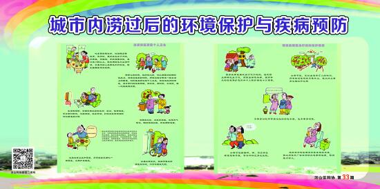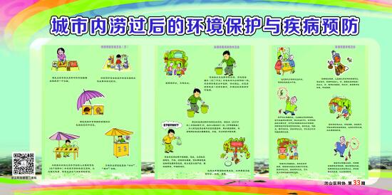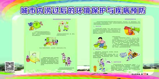 7月初的强降雨造成洪山辖区多个小区和道路被淹,内涝严重且时间长,此状况极易产生内涝后的疾病传播。针对此情况,洪山区科协及时组织开展了城市内涝后环境清理及疾病防治应急科普宣传。编制了15张关于城市水涝后的环境消毒、用水清洁、家庭卫生清理、居室环境灭蚊蝇、易发疾病防治、个人卫生等方面的科普宣传挂图。共制作了400多张,在分布于各个社区的95处科普专用橱窗张贴。及时指导社区居民开展水涝后的自我防护,避免次生灾害发生。