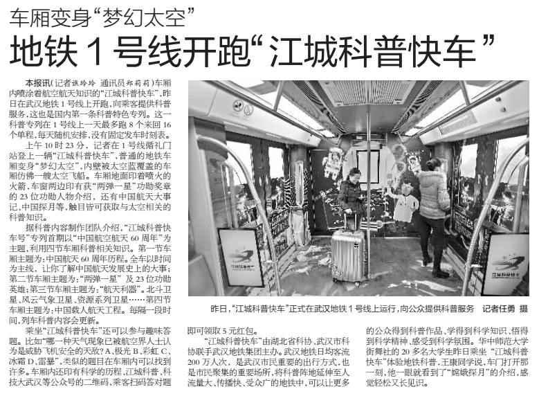 昨日,“江城科普快车”正式在武汉地铁1号线上运行,向公众提供科普服务