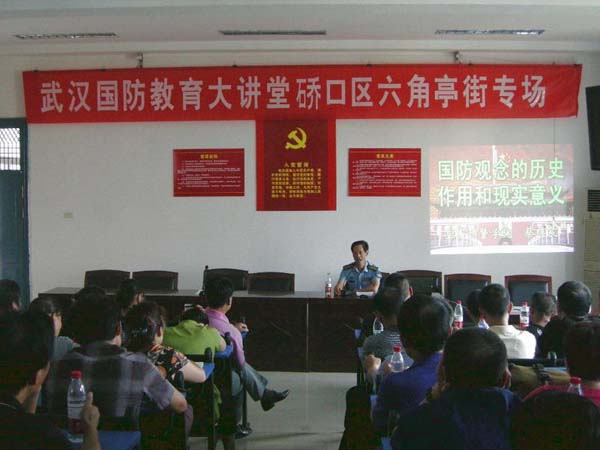 市科协网讯 9月15日下午,六角亭街举行了“武汉国防教育大讲堂硚口区六角亭街专场”报告会。报告会由六角亭街工委副书记许建新同志主持,市国防教育讲师团成员、空军预警学院蔡梓良教授为六角亭街10个社区群干、专干近90人作了题为“国防观念的历史作用和现实意义”的专题报告。