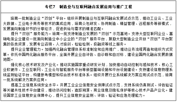 推进信息化和工业化深度融合。在推进实施“中国制造2025”过程中,深化制造业与互联网融合发展,加快构建自动控制与感知技术、工业软硬件、工业云与智能服务平台、工业互联网等制造业新基础,建立完善智能制造标准体系,增强制造业自动化、数字化、智能化基础技术和产业支撑能力。组织实施“芯火”计划和传感器产业提升工程,加快传感器、过程控制芯片、可编程逻辑控制器等研发和产业化。加快计算机辅助设计仿真、制造执行系统、产品全生命周期管理等工业软件的研发和产业化,加强软件定义和支撑制造业的基础性作用。支持开展关键技术、网络、平台、应用环境的兼容适配、互联互通和互操作测试验证,推动工业软硬件与工业大数据平台、工业网络、工业信息安全系统、智能装备的集成应用。积极推进制造企业“双创”以及工业云、工业大数据、工业电子商务等服务平台建设和服务模式创新,全面提升行业系统解决方案能力。推动工业互联网研发应用,制定工业互联网总体体系架构方案,组织开展工业互联网关键资源管理平台和核心技术试验验证平台建设,加快形成工业互联网健康发展新生态。组织实施企业管理能力提升工程,加快信息化和工业化融合管理体系标准制定和应用推广。