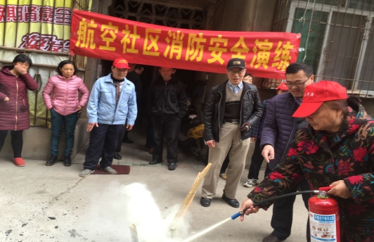 为防范居民意外消防事故,减少居民消防损失,针对航空社区辖区内的5﹑6号楼居民老年人多,楼宇间道路狭窄,消防通道缺失的客观情况,航空社区工作人员在2017年3月10日上午9:30召集当地居民和第五网格支部居民组织实施了一场实地消防培训和高楼逃生演练。