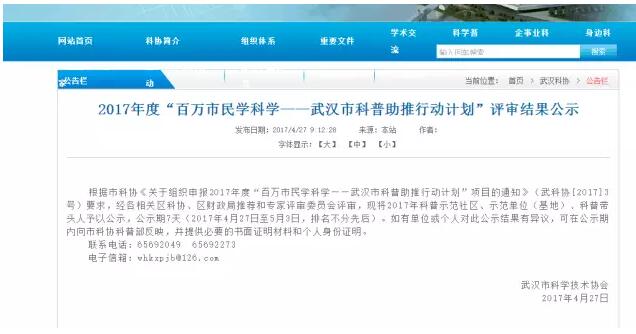 近日,从2017年“百万市民学科学——武汉市科普助推行动计划”评审结果获悉,经各基层科协组织申报,武昌区科协、区财政局审查推荐、评审委员会认真严格评选,媒体公示,武昌区入选10个科普示范社区和一家科普示范企业,分别是徐家棚街三角路社区、积玉桥街四清里社区、中华路街户部巷社区、粮道街东龙社区、紫阳街起义门社区、白沙洲街长江紫都社区、首义路街江零社区、中南路街宝通寺社区、水果湖街徐东路社区、南湖街宁松社区和杜莎夫人展览(武汉)有限公司。
