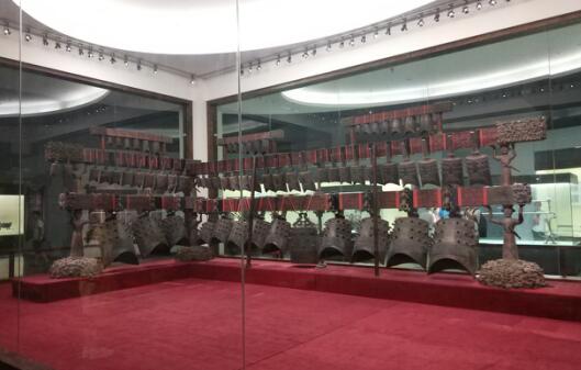 曾侯乙墓葬文物中最举世闻名的则是被誉为“镇馆之宝”的曾侯乙编钟。1978年湖北随县出土的曾侯乙编钟,由青铜浇铸而成,钟体遍饰细密精致的浮雕式蟠虺纹。钟架长748厘米,高265厘米,重4.5吨左右,气势磅礴,令人叹为观止。全套编钟共六十五件,分三层,八组悬挂在呈曲尺形的铜木结构钟架上。大家怀着崇敬震撼的心情仰望着具有千年历史饱经沧海桑田的编钟,耳边仿佛听见其宛若天籁的钟声,感觉时间都随之沉淀、静止。曾侯乙墓编钟的铸成,表明我国青铜铸造工艺的巨大成就,更表明了我国古代音律科学的发达程度,它是我国古代人民高度智慧的结晶,更是我们中华民族的骄傲。
