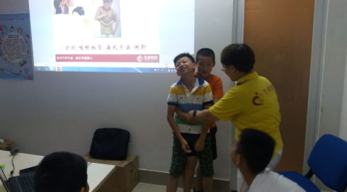 活动现场,邝老师还通过互动形式教授孩子们气道异物堵塞的判断及现场救护技术,学生和家长们都踊跃参加,现场气氛十分活跃。特别是针对暑期高发的儿童溺水事件,邝老师呼吁小朋友们外出旅游和游泳时需要家长陪同,防止溺水等意外事件发生,然后给孩子们详细讲解了溺水后自救及他人溺水后如何正确施救的正确方法。