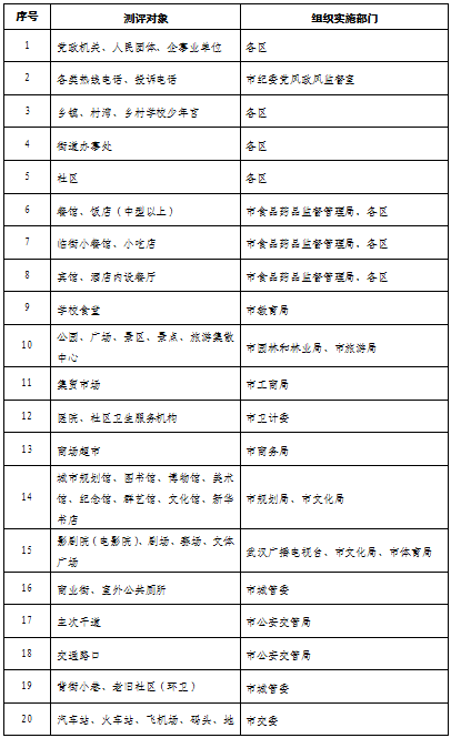 测评采取实地考察、问卷调查方式,由各区及各行业、系统、战线单位自行组织实施。重点公共场所测评标准详见市文明委《关于印发〈武汉市文明城市建设重点公共场所实地考察点位测评标准〉的通知》(武文明〔2017〕19号)。