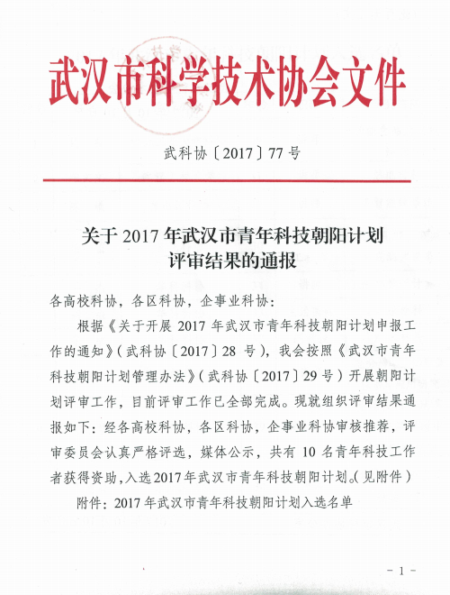 关于2017年武汉市青年科技朝阳计划评审结果的通报