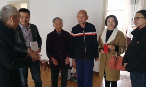 在困难群众孙正怀家中,对接党员干部、机关第一支部书记彭竹春、宣传委员曾波对残疾老人孙正怀嘘寒问暖,耐心地传达了党的十九大精神,并将《党的十九大报告》、《中国共产党章程》单行本送到其家人的手中。孙正怀老人眼含泪花,激动不已。一直照顾他、已年过七旬的姐姐连声道谢,感谢党的好政策、感谢党员干部对他们的关心帮助。