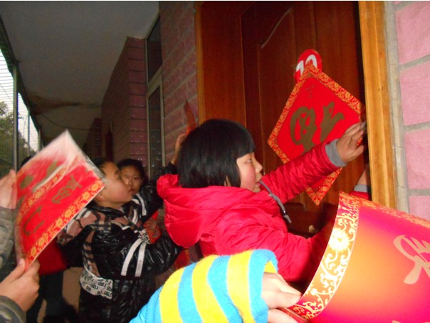 2013年2月4日,硚口区宗关街发展社区的小小志愿者们带着春联,为住在社区老年公寓的老人们贴春联。