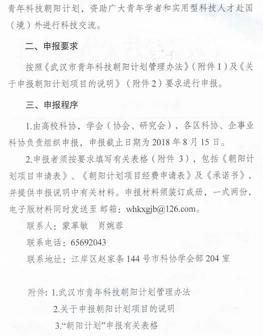 附件: 1、武汉市青年科技朝阳计划管理办法 2、关于申报朝阳计划项目的说明 3、“朝阳计划”申报有关表格