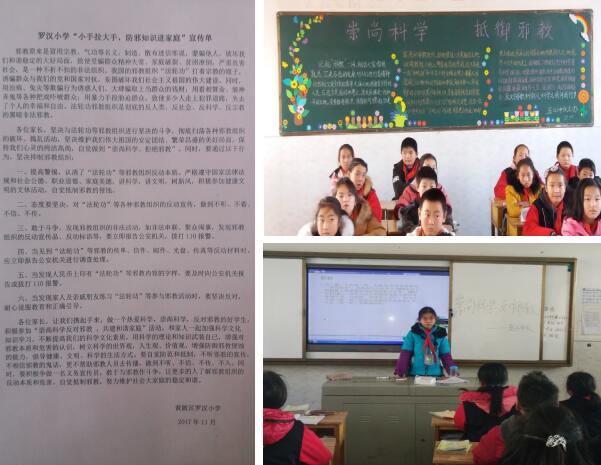 三是充分利用“小手牵大手”的形式,发放《家庭拒绝邪教提示卡》、《罗汉小学“小手拉大手,防邪知识进家庭”宣传》等宣传材料,向学生家庭和社会宣传反邪教知识。