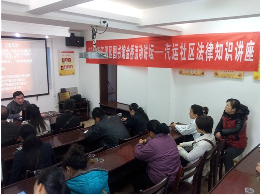 为增强社区居民的法律意识,提升居民知法、懂法、用法的能力,积极营造居民学法、懂法、守法的氛围。2013年4月23日上午,江汉区唐家墩街汽运社区居委会特邀江汉区图书馆“金桥”流动讲坛为社区居民宣传法律知识以及法律咨询,近30名居民参加讲座。
