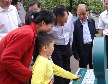 青山区委副书记刘栿堂、武钢总工程师傅连春与小朋友一起操作科普展具