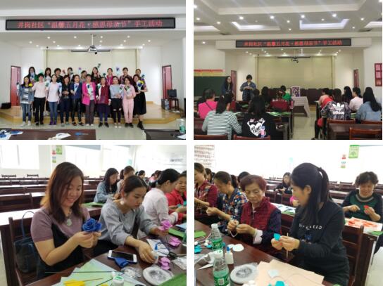 一年一度的母情节即将来临,大力弘扬理解母亲、热爱母亲、孝敬母亲的良好风尚,使母亲们都能感受到节日的温馨、快乐,井岗社区2018年5月11日在家长学校开展“温馨五月花 感恩母情节”手工制作玫瑰花活动,特邀飞雪文化陶老师来指导,共吸引居民26人参加。