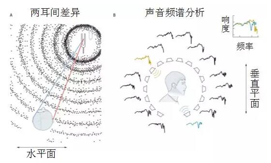 在水平面上,我们可以通过我们两个耳朵之间感受到的声音的时间以及响度等等方面的差异,来看在水平面上声音是来自于哪个方向。在竖直方向上,我们可以通过分析声音的频谱,比如说上图B中是竖直平面上各种方向传来的声音,取图中的两个例子,把它们叠加到一起来看,可以发现在频率比较高的部分,它们的响度是有很大的差异的。这样通过声音频谱的分析,我们就可以判断声音在竖直方向来自于哪里。