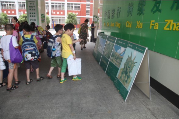 展品周边,一幅幅图文并茂、栩栩如生的3D展板则详细介绍了恐龙的种类、恐龙的起源、进化和灭绝的过程等内容,带领同学们一起走进“恐龙的世界”。