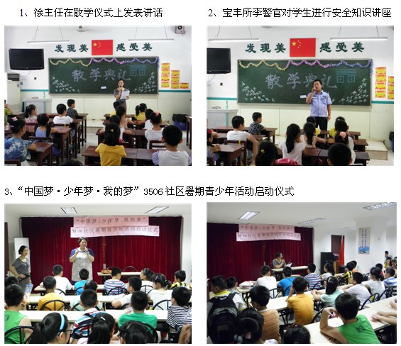 为扎实开展好暑期青少年教育活动,为了让青少年们拥有一个充实而快乐的暑期生活,3506社区于7月4日举行了“中国梦﹒少年梦﹒我的梦”青少年活动启动仪式,并邀宝丰派出所李警官一同走进辖区体育馆小学,参加他们的散学典礼和社区活动启动仪式。