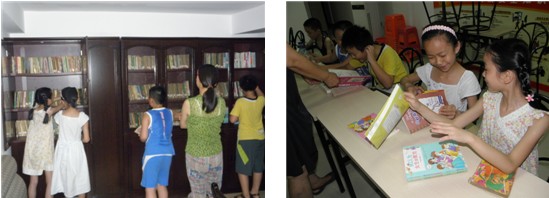 社区青少年们来到社区二楼图书室,争先恐后的挑选自己喜爱的书籍,女生们挑选了一些《爱哭的女生也坚强》《我不是完美女生》的帮助他们成长的书籍,二男生们则挑选了一些《名侦探柯南》《小屁孩日记》《一代天骄》等侠义、推理类的书籍。大家捧着自己心爱的书籍来到一楼纳凉室,端正的找到自己的位置,安静的融入在书海中,偶尔互相交流,偶尔相互借阅,并各自向社区借阅了一本自己喜爱的书籍回家,深入细致的学习各类知识。