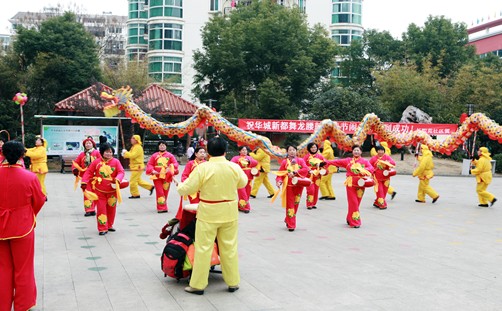 元宵佳节,在我国许多地方有舞龙灯的习俗。元宵舞龙也是中国独具特色的民间娱乐活动,表达了人们对美好生活的祝愿和欢庆2014年2月11日元宵节来临之际长职苑社区女子龙鼓队浩浩荡荡来到了华城新都小区休闲广场,给社区居民带去新春祝福。咚……咣……锵!”在振奋人心的锵锵锣鼓声中,一条昂首摆尾的长龙破云而出。居民和孩子们兴奋地观看舞龙表演,用相机、手机争相抓拍,传出阵阵叫好声。一张张笑脸洋溢着过年的喜庆气息,此次活动融入民俗、传统元素,让淳朴的民间艺术营造出了浓浓的喜庆气氛!看着她们健步如飞,时而跑步前进,时而跳跃而起,可曾想到她们都是年近60岁左右的退休人员呢。队长朱阿姨说“舞龙不仅锻炼了身体,还能参加公益演出,也算是退休后发挥余热、回报社会了,她和她的姐妹们都表示,只要身体好,就会一直舞下去”。在一片欢声笑语声中社区龙鼓庆元宵既传承和发扬了民间文化艺术,又丰富了社区居民的文化生活。