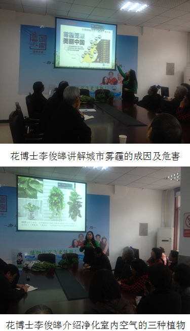 武汉植物园通过“植物进社区”活动,践行党的群众路线,服务辖区居民,得到了居民们热烈响应。在关山街纺大社区市民学校的教室里,花博士李俊皞老师向居民朋友们讲解了城市雾霾的成因,雾霾的危害,有什么方法能够降解雾霾的袭扰和对身体健康的影响?花博士向居民们介绍了能够净化室内空气,降解雾霾袭扰的三种植物——散尾葵、虎皮兰、绿萝。她以实物为例详细地讲解了这些植物为什么能清新空气,降解室内PM2.5的科学理论依据 ,并向在场的居民们讲授了这三种植物的栽培技术。之后,花博士向居民们送上了她带来的礼物——虎尾兰。