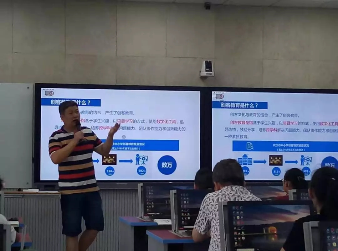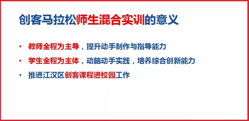 “创客马拉松”实训活动以学生为主体,教师全程参与。既可以发挥学生的主观能动性、培养学生动脑动手实践的综合创新能力,又可以锻炼教师的创新指导能力。从而推进和提升江汉区创客课程进校园工作。