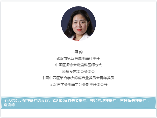 周 伶 武汉医学会疼痛学分会副主任委员、武汉市第四医院疼痛科主任