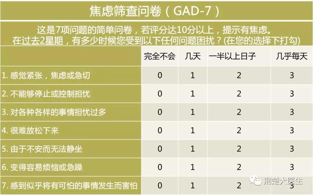 3.当你觉得情绪问题很严重,如焦虑、恐惧、担心、无助无望的情绪强烈且无法消除,或出现明显的睡眠问题,请及时找到专业医生咨询。咨询前先做焦虑抑郁量表初步评估。